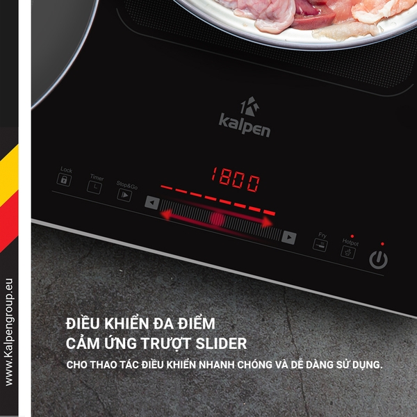 Thiết kế hiện đại theo tiêu chuẩn Đức với công nghệ điều khiển đa điểm cảm ứng trượt Slider cho thao tác điều khiển nhanh chóng và dễ dàng sử dụng. Nhờ đó mà bạn có thể thoải mái các thao tác đun nấu trên bếp từ mà không lo bất cứ về vấn đề gì. Chính vì bếp từ thương hiệu Kalpen đã được trang bị các chất liệu tốt, do đó cũng sẽ kèm theo chất lượng và công dụng tốt nhất giúp đơn giản hóa việc nấu ăn hàng ngày trên bếp từ, chỉ nhắc đến đây thì đã thấy rằng thương hiệu bếp từ Kalpen là sản phẩm của mọi nhà.