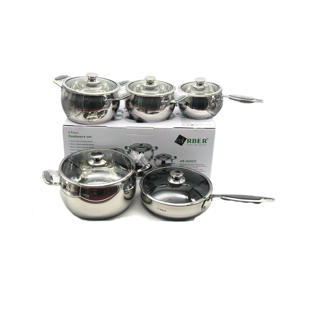 Bộ nồi Arber AB06CC 5 món làm bằng chất liệu inox 304, đáy bộ nồi 3 đáy siêu bền khi sử dụng, bộ nồi tiếp xúc nhiệt nhanh, êm, tản nhiệt đều khi nấu. Bộ nồi từ cao cấp ARBER đạt các tiểu chuẩn và chất lượng được cấp chứng chỉ sản phẩm.