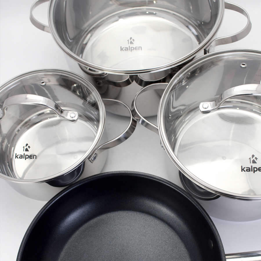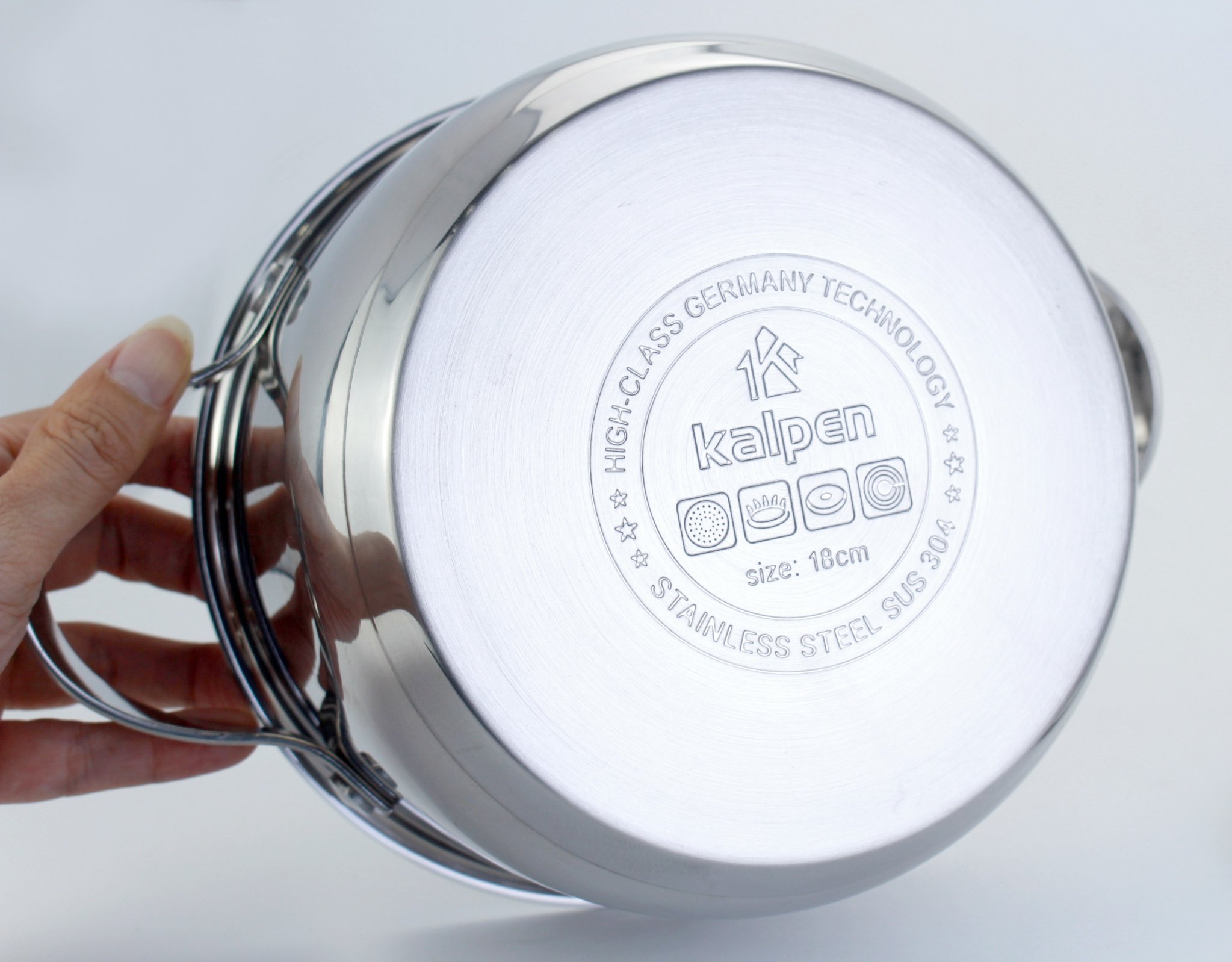 Bộ nồi Inox 5 lớp đáy của Kalpen được làm từ chất liệu Inox 5 lớp, với đáy nồi có thiết kế đặc biệt để giúp nồi truyền nhiệt đều và nhanh chóng. Điều này giúp cho việc nấu nướng trở nên hiệu quả khi có thể sử dụng được trên nhiều loại bếp khác nhau.
