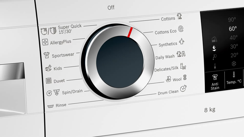 – Chương trình: Cottons, Cottons Eco, Synthetics, Daily Wash, Dellicates/Silk, Wool, Drum Clean, Rinse, Spin/Drain, Duvet, Kids, Sportswear, AllergyPlus, SuperQuick 15″/30″