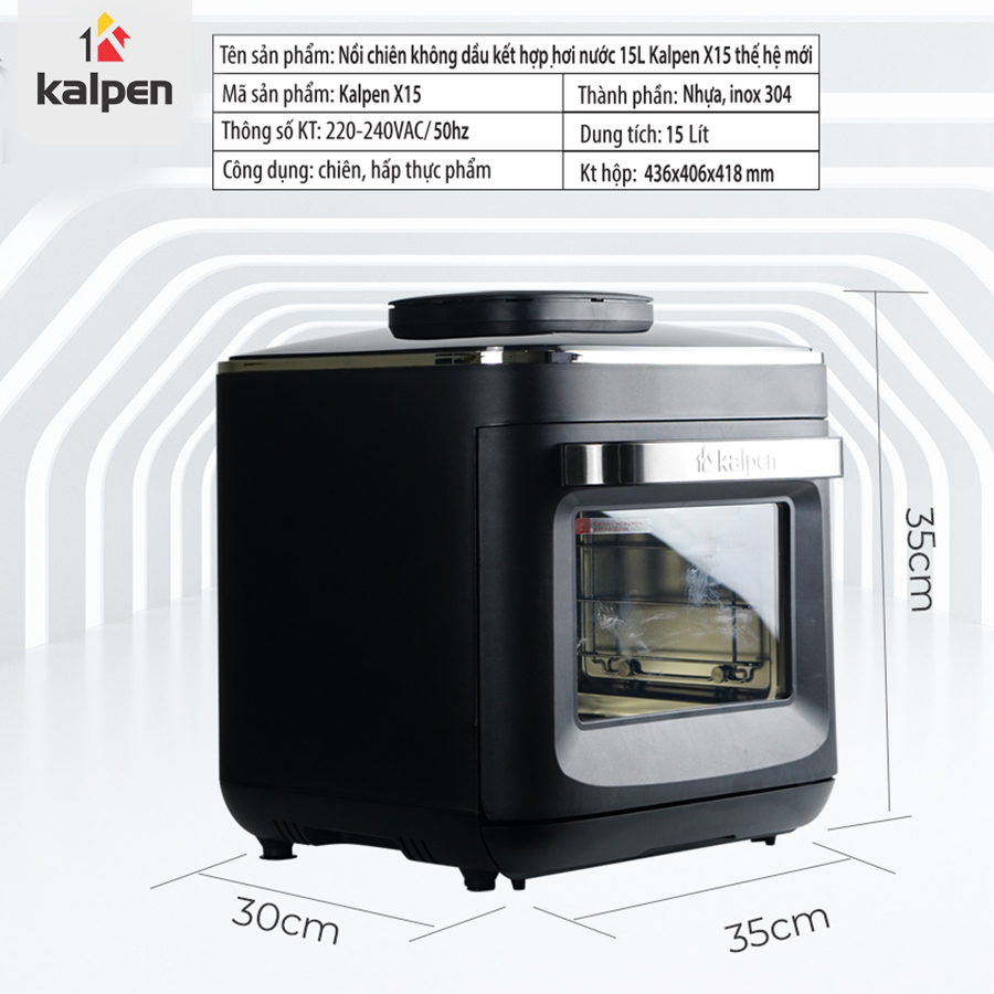 Xin giới thiệu Siêu phẩm mới Nồi Chiên Không Dầu Hơi Nước Kalpen X15, là bước đột phá với công nghệ Steam Frying, giải quyết vấn đề khô mất chất của đồ ăn khi chiên. Đạt kết cấu hoàn hảo 5 sao, thêm giòn, ngon ngọt cho mỗi món ăn của bạn bằng cách kết hợp Chiên Hấp trong một chiếc nồi. Qua đó tạo ra những thành quả tuyệt ngon. Giúp bạn thưởng thức các món ăn, đồ ăn nhẹ và món tráng miệng... thêm hấp dẫn. Công nghệ Steam Frying tiên tiến của chúng tôi sử dụng áp suất phù hợp cung cấp đủ độ ẩm trong khi vẫn giữ lại các vitamin và chất dinh dưỡng trong thịt gà, thịt, khoai tây, rau và cá của bạn.. Khay nước chất liệu cao cấp, được đúc khuôn độc nhất vô nhị của chúng tôi mang đến cho thịt của bạn hương vị tuyệt vời và hoàn hảo. Tiện lợi nhất là dung tích lớn nhất từ trước đến nay chứa được tới 15 lít thực phẩm, được coi như một loại nồi chiên không dầu size XXL. Giờ đây, bạn dễ dạng phục vụ một bữa ăn thịnh soạn cho đủ 8 người. Giảm tới 99% chất béo, giúp bạn có một chế độ ăn uống lành mạnh hơn. Tăng hương vị cho các món ăn, ít calo hơn cho sức khỏe và thêm lựa chọn cho việc nấu nướng. Kalpen tự hào giúp cuộc sống của bạn dễ dàng, thông minh và lành mạnh hơn.