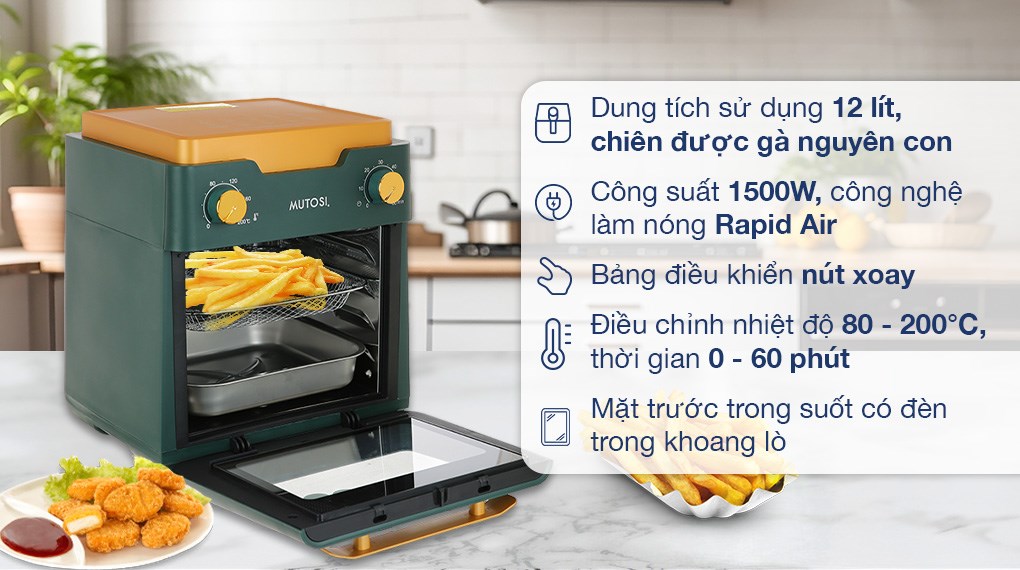 Lò chiên không dầu Mutosi MF-98C 12 lít chiên nướng thức ăn nhanh chóng, giảm dầu mỡ mà vẫn đảm bảo hương vị thơm ngon với công suất 1500W, công nghệ làm nóng Rapid Air, bảng điều khiển nút xoay dễ dàng thao tác.