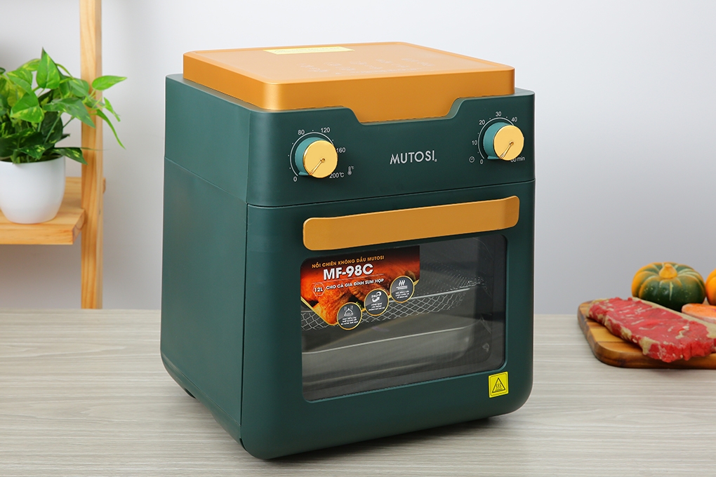 Lò chiên không dầu Mutosi MF-98C 12 lít thiết kế sang trọng, màu sắc nổi bật, chiên nướng nhanh chóng với công suất 1500W, giảm chất béo, tốt cho sức khỏe của gia đình với công nghệ làm nóng Rapid Air, điều khiển nút xoay dễ sử dụng, có nắp kính trong suốt và đèn trong khoang lò cho bạn quan sát thức ăn bên trong tiện lợi.