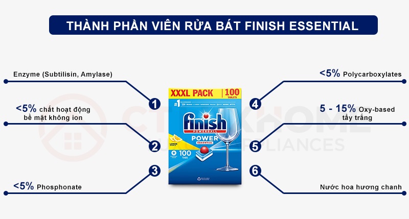 Các thành phần và hàm lượng hoạt chất trong viên rửa chén Finish Essential 100 viên đều đã được chứng nhận an toàn quốc tế. Các thành phần chính bao gồm: